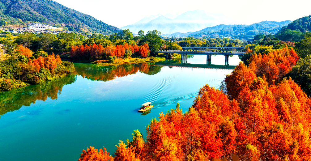流溪河畔,水杉笔直挺立,层层叠叠的红叶将河面晕染出暖色调。清澈的流溪河水如镜面般倒映着红杉与远山,游船悠然划过,漾开圈圈涟漪,动静之间,山水相映的诗意画面令人沉醉。